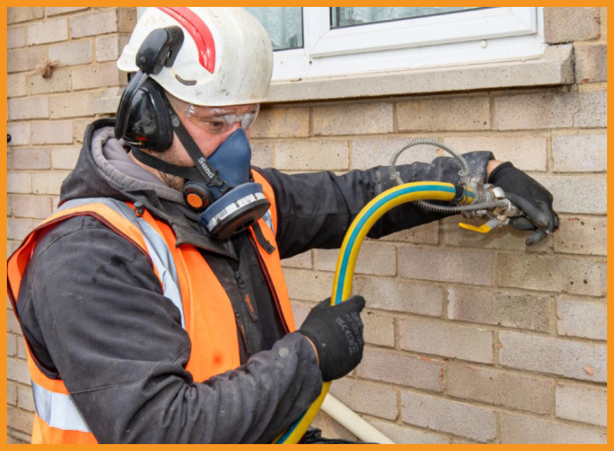 Insulation, (either mineral wool or polystyrene beads), is blown into the cavity using special equipment. Once all the insulation is in, the installer fills the holes in the brickwork so they are barely noticeable. It generally takes around two hours to insulate an average house with easily accessible walls.